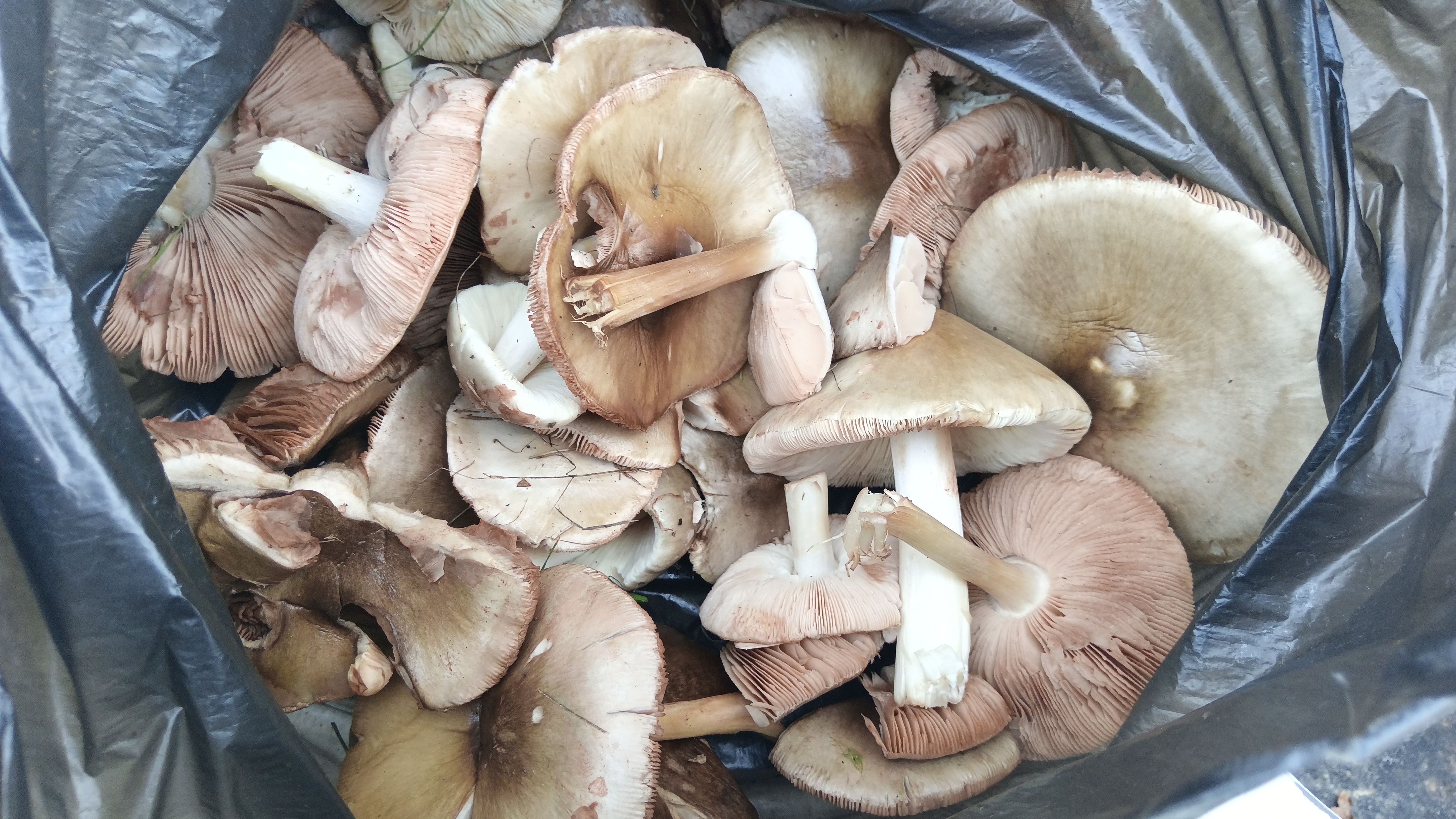Да, я знаю, что надо грибам, чтоб расти. И не я один это знаю. И не было дождей уже несколько дней. И были толпы других знатоков. Но.. мы поехали. Наугад, в то место, где часто случаются туманы и где Солнце греет южные склоны. И где трава не столь высока, а деревья... ну, все знают эти принципы. И мы "совсем случайно" (реально впервой были в этом месте) набрали пару пакетов FA (типа, 25 кг прочности) этих самых "зонтиков" и "синеножек". Старые, сухие, червивые грибы не брали.