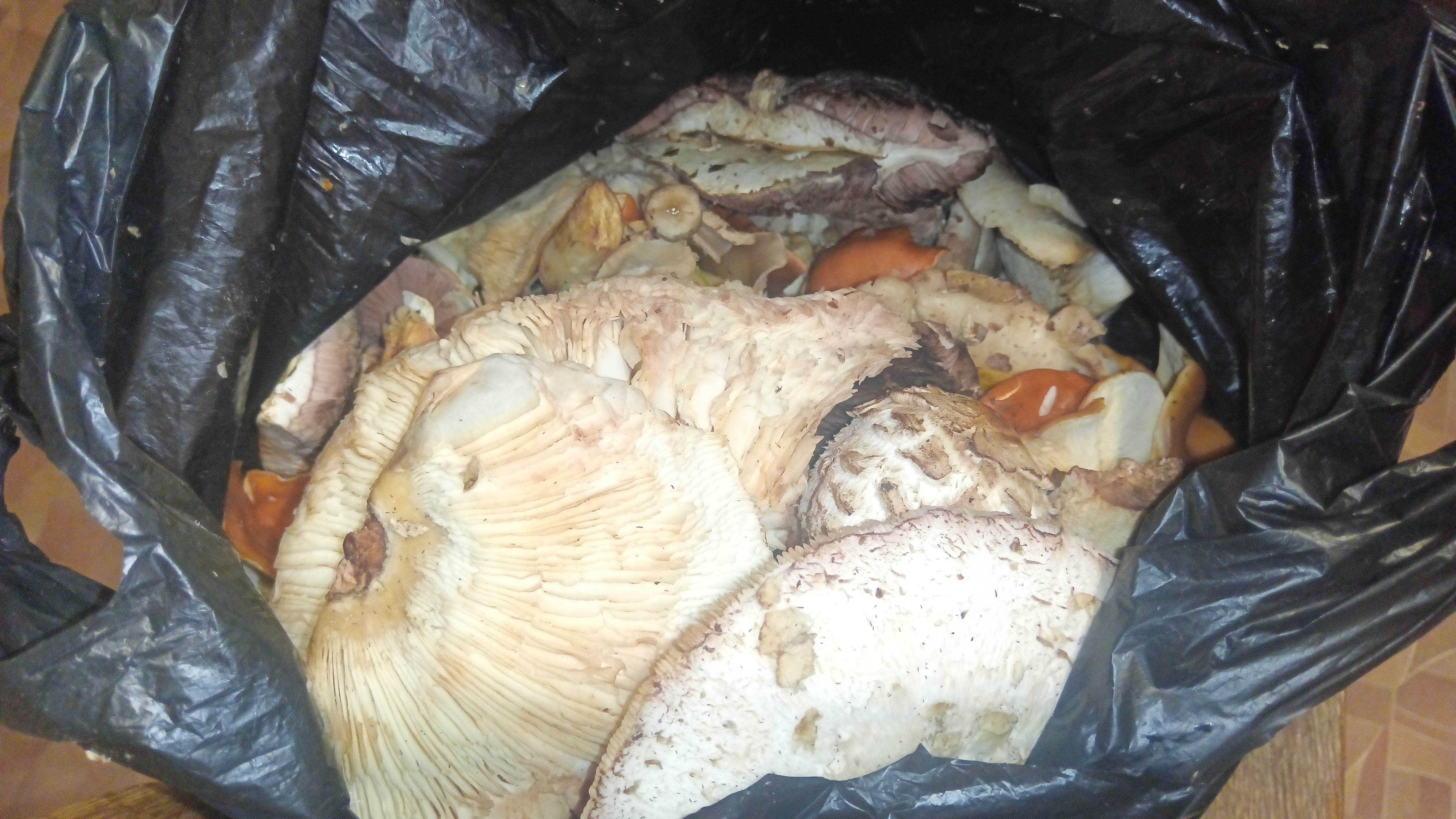 Пришли домой... жена собиралась на работу, но я сунул ей добычу с приказом - разобраться. Она взяла парочку грибов, остальное выставили в тень на балкон.